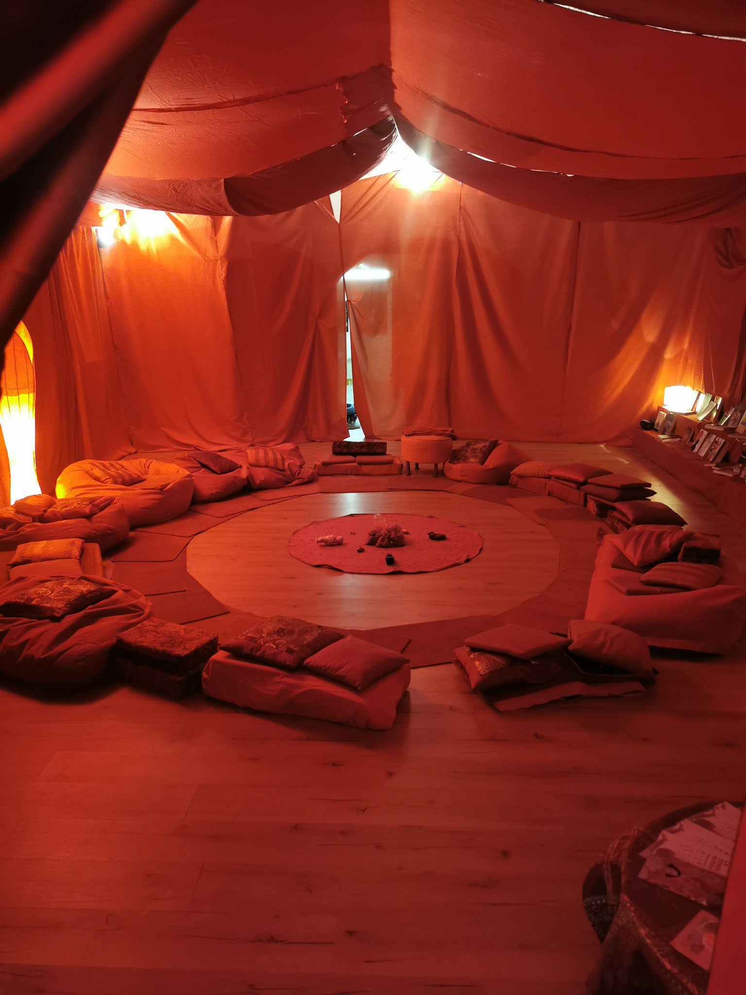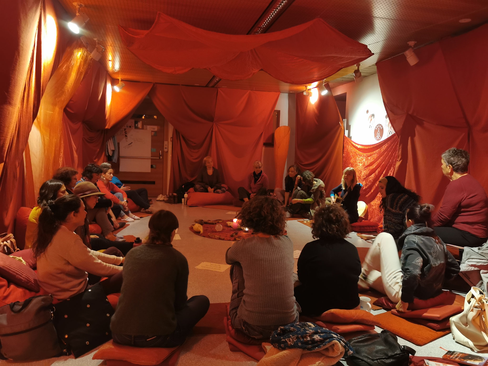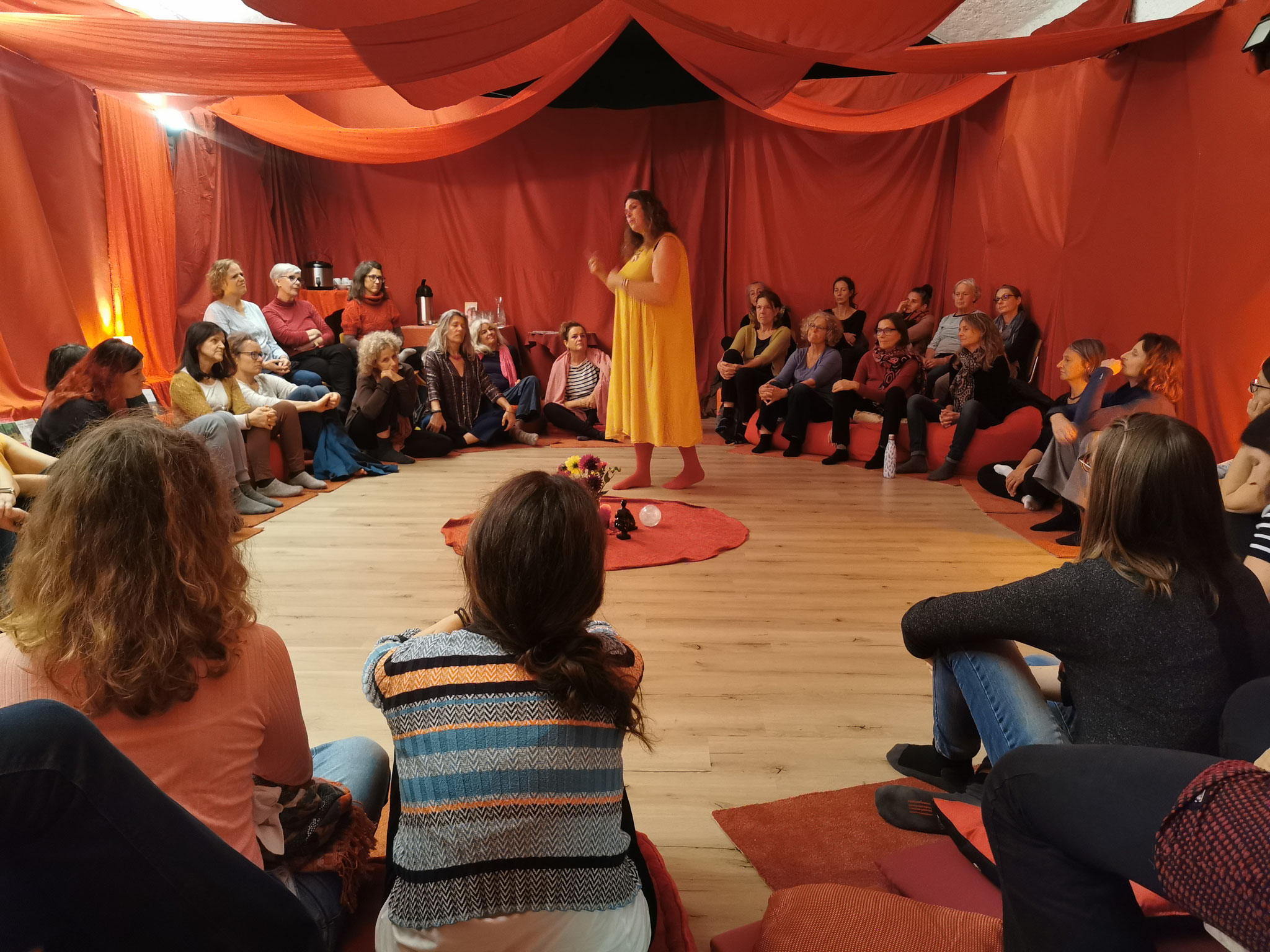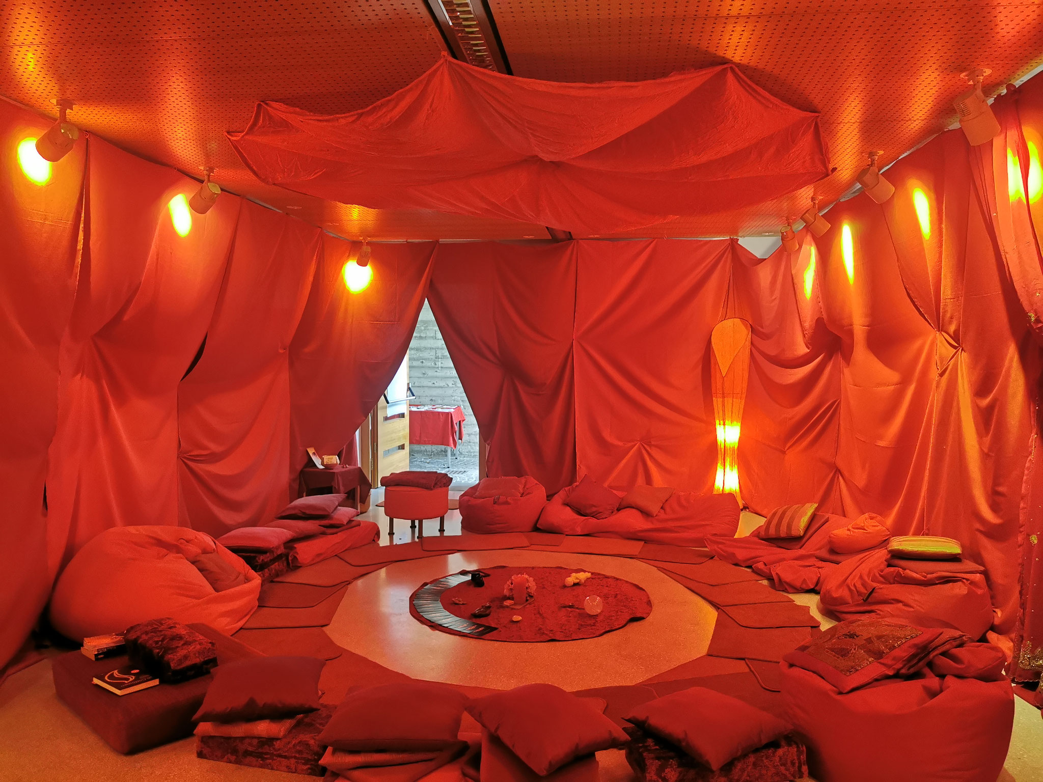 „Das Rote Zelt“, der rot dekorierte Raum, der im Herbst für eine Woche in Mals und in Meran seine Tore öffnet, in dem Frauen sich informieren, stärken und nähren; zuhören und gehört werden, gemeinsam lachen und weinen können, die Verbindung spüren und neue Sicht- und Lebensweisen kennenlernen.